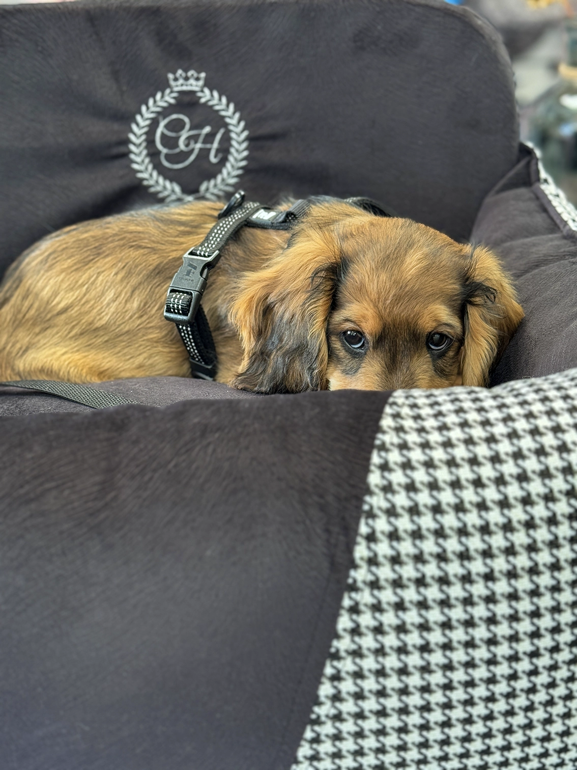 Den exklusiva PORTO-kollektionen erbjuder en sofistikerad kombination av det tidlösa hundtandsmönstret och det moderna sammetsmaterialet. Tillverkad av högkvalitativa tyger, är denna bilstol inte bara en säkerhetsprodukt utan även en stilfull accessoar för din fyrbenta vän.