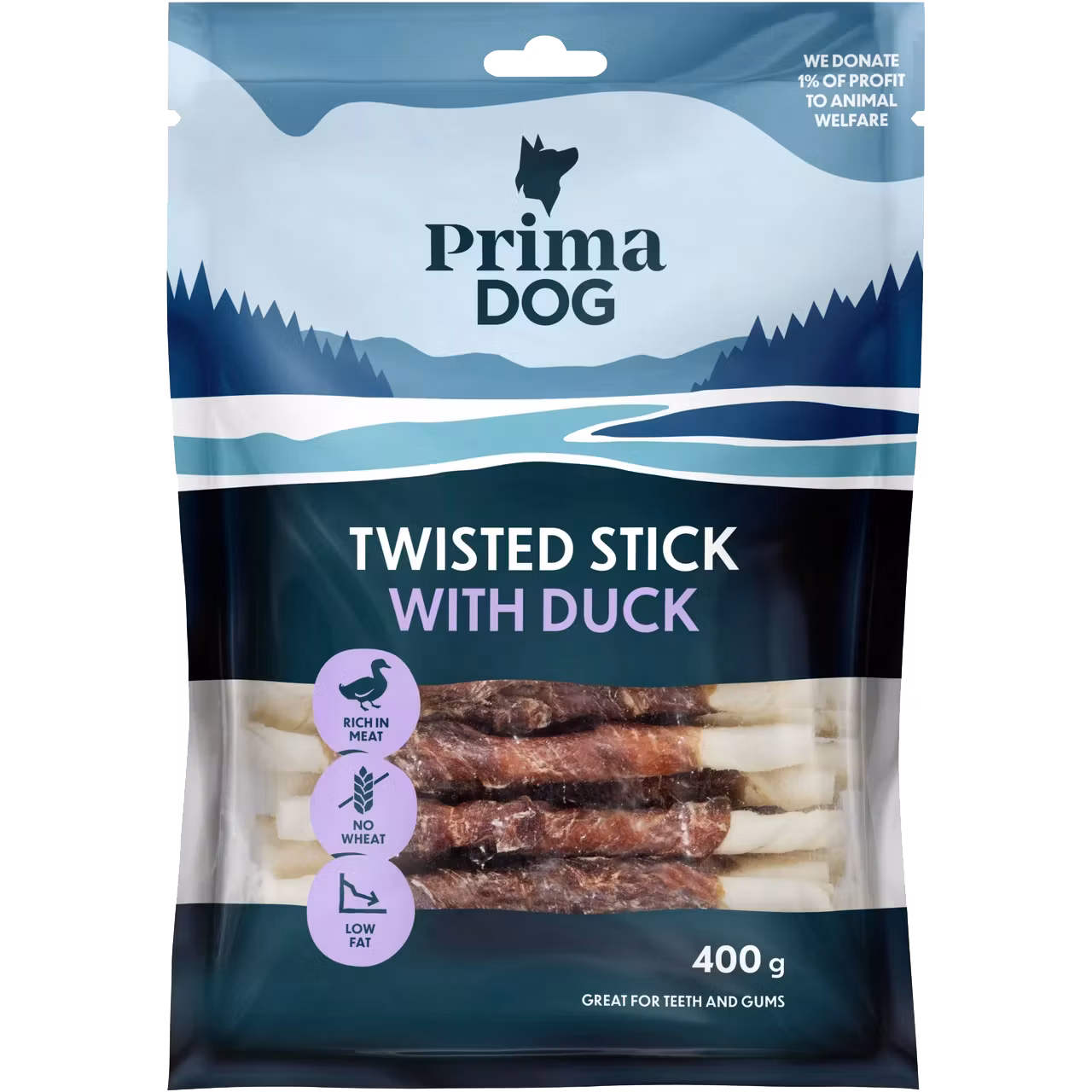 PrimaDogs Tuggpinne med anka är ett delikat tuggben som har lindats in i saftig ankfilé. Tuggbenet av nöthud hjälper att hålla din hunds tänder rena, och ankfilén ger den här lätta delikatessen smak.