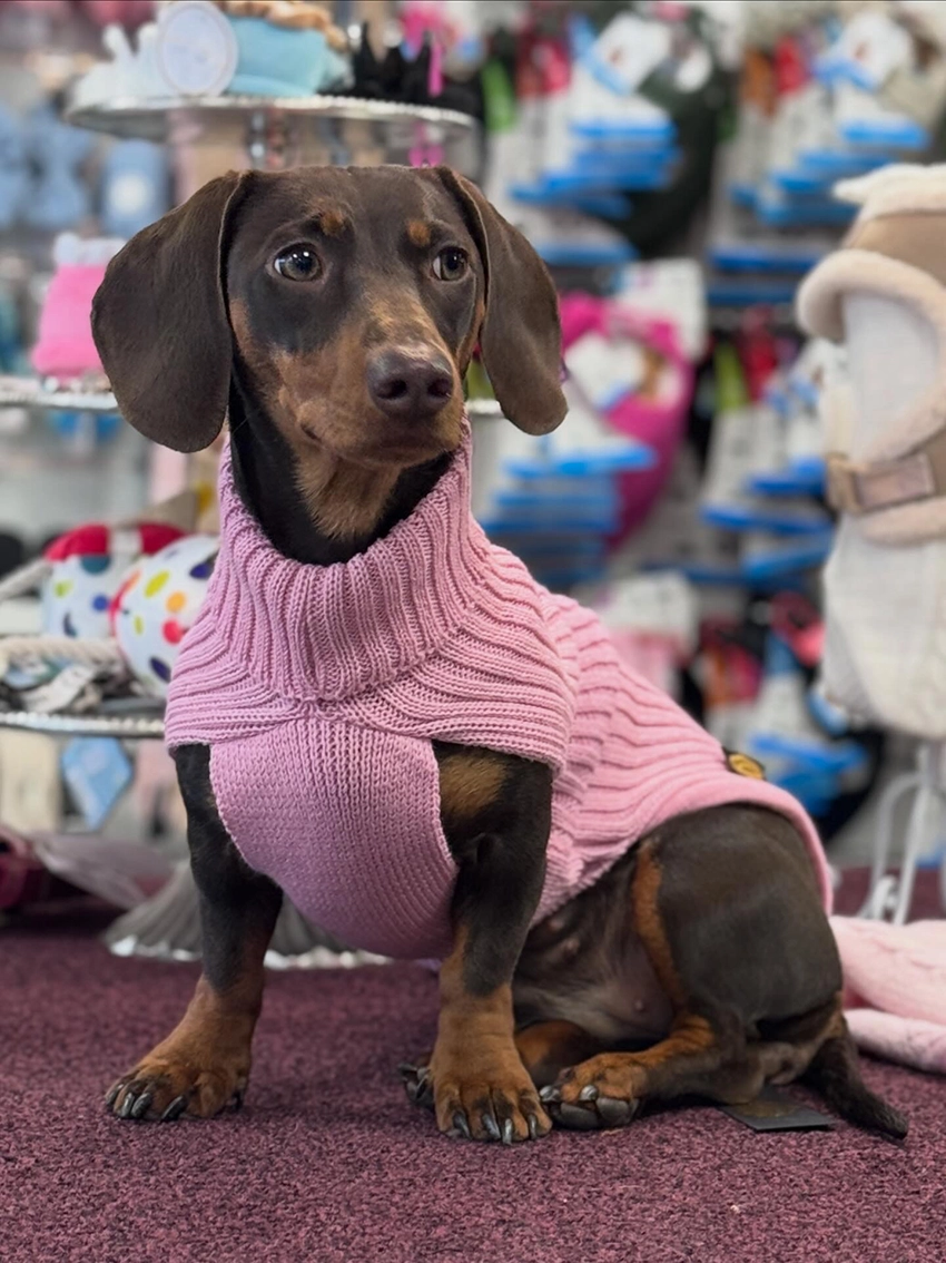 Den finns i fler färger och i stora och små storlekar för att passa alla kroppstyper. Eftersom den är stretchig är den särskilt bra för taxar och andra raser som har svårt att hitta tröjor.