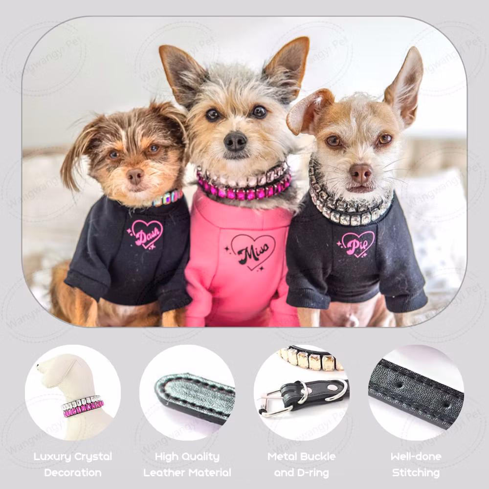 Halsbandet är tillverkat i konstläder och dekorerat med gnistrande stenar som ger ett elegant uttryck utan att ta över. Finns i flera storlekar för att passa både små och större hundar.