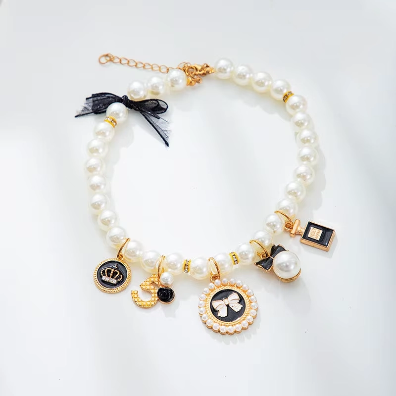 Halsbandet är dekorerat med konstpärlor och små berlocker som ger en klassisk och elegant känsla. Designen är lätt och nätt, anpassad för katter och mindre hundar. Det här är ett accessoarhalsband snarare än ett funktionellt halsband för koppel.