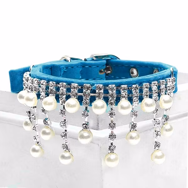 Festligt och fint halsband till katt eller hund. Med gnistrande strass och pärlor på sammetshalsband. Skärpknäppning.