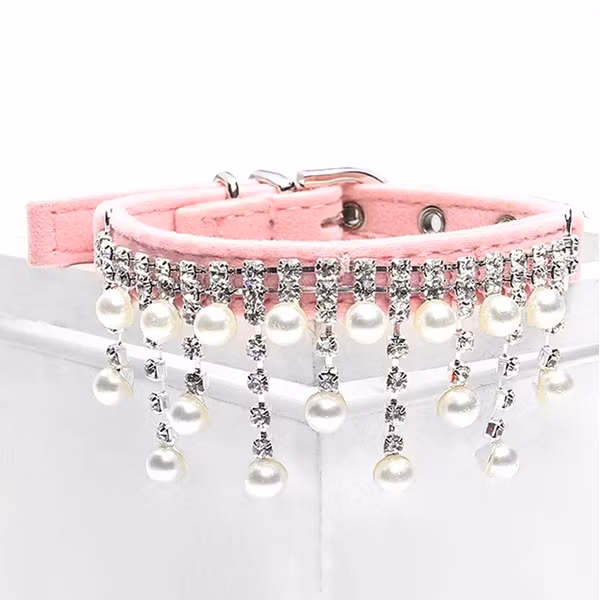 Festligt och fint halsband till katt eller hund. Med gnistrande strass och pärlor på sammetshalsband. Skärpknäppning.