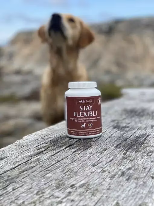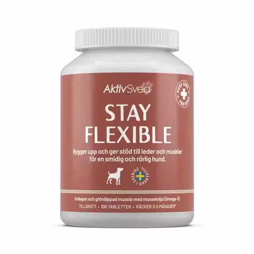 Stay Flexible ges som komplement till hundens dagliga foder. Tuggvänliga tabletter som ges i samband med mat. Har smakgaranti och uppskattas av de allra flesta hundar.