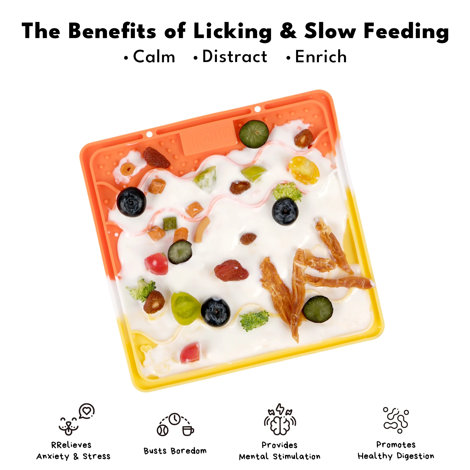 Slickmattan är tillverkad i högkvalitativ, livsmedelsgodkänd silikon som är både mjuk och slitstark. Materialet är fritt från BPA och tryggt att använda varje dag. På undersidan finns 36 kraftiga sugkoppar som håller mattan stadigt på plats på släta ytor – perfekt vid bad, kloklippning eller när du vill distrahera din hund under pälsvård.