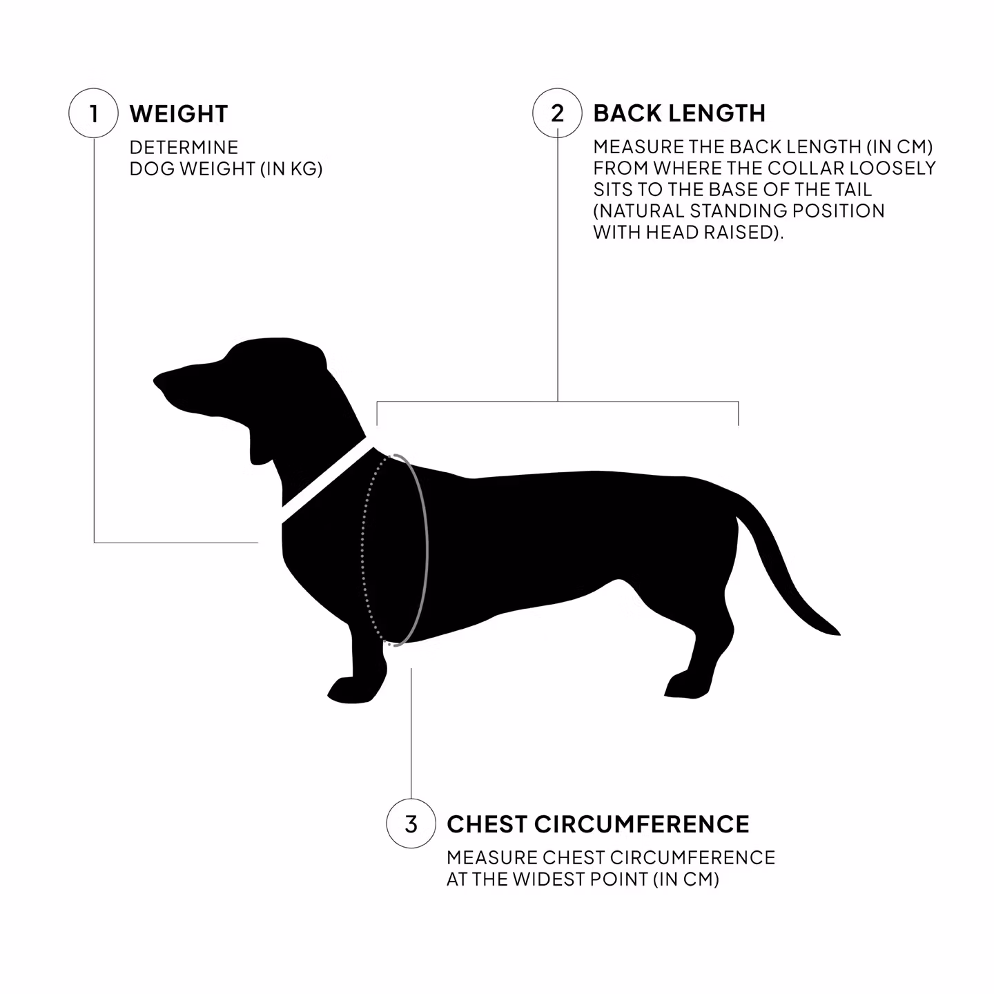 Mät alltid hundens rygglängd noggrant och jämför med storlekstabellen. Ligger din hund mellan två storlekar rekommenderas den större för en bekvämare passform.