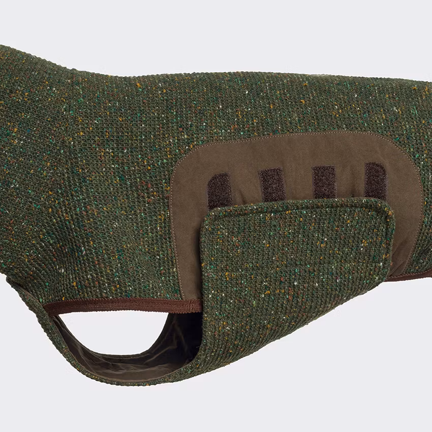 Den mjuka och varma hundtröjan i traditionell alpin look ger vid sidan av värmen från dubbelskiktad mörkgrön stickning, bekväma jersey- och vaxade bomullsplåster, en elegant och idealisk passform för hundar. Kardborrbanden på båda sidor av hundtröjan gör att du enkelt kan sätta på tröjan på hunden. För maximerad komfort tillåter brösttäckningen maximerad rörlighet genom att inte störa de naturliga rörelserna. Dog Sweater Dorset är den perfekta hundtröjan för övergångsväder.
