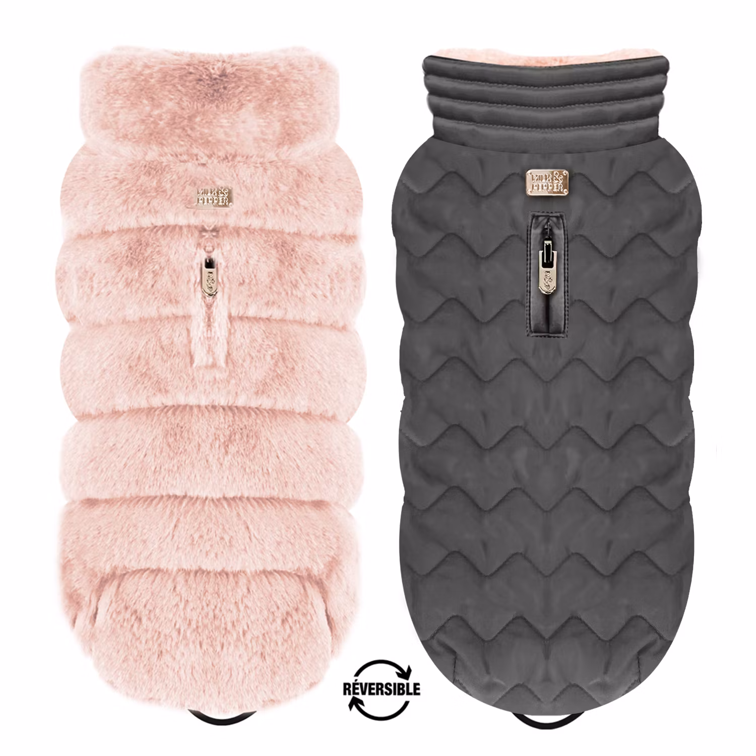 - sida ett: puderrosa fantasy päls - sida två: antracitgrå quiltad polyester (vattenavvisande)