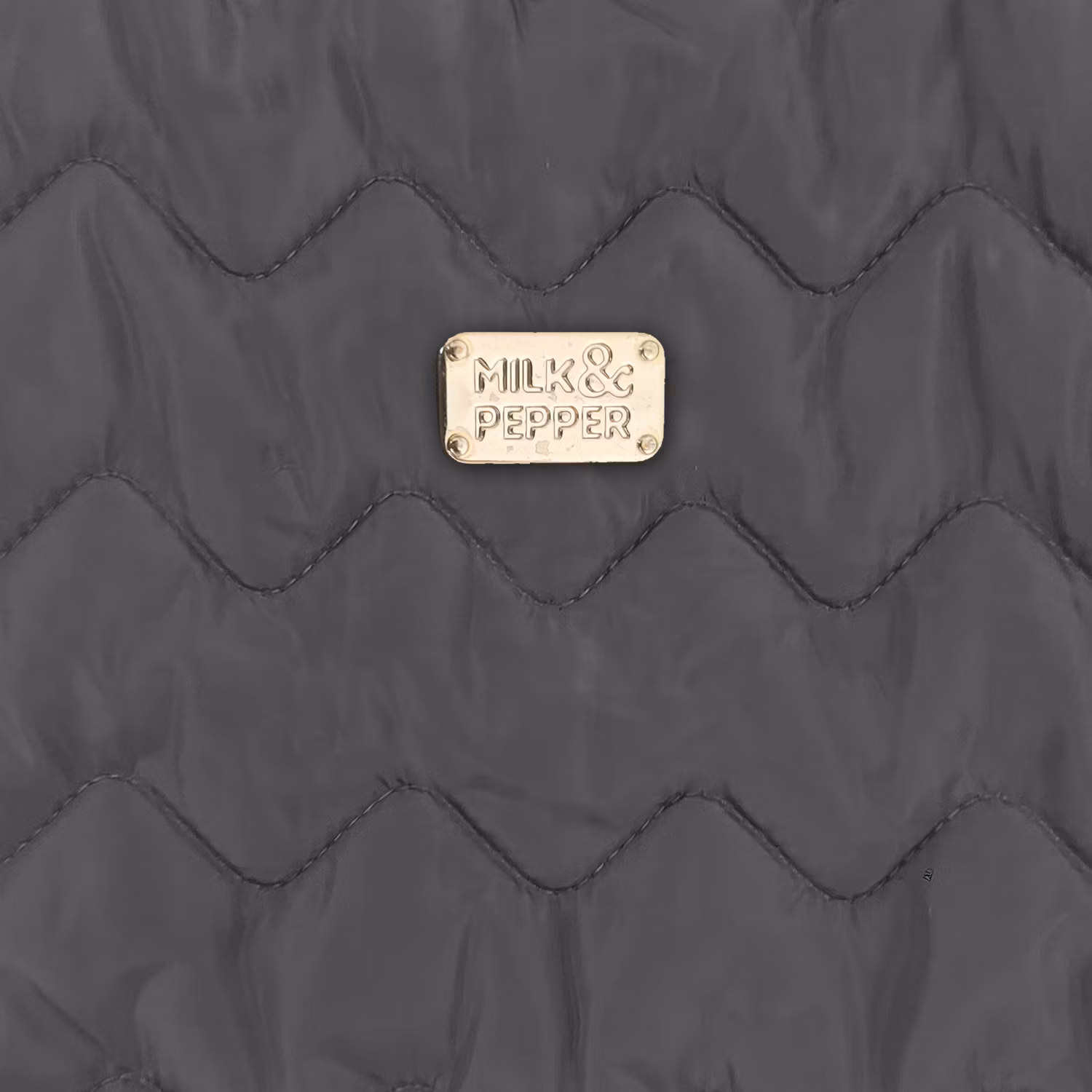 - Liten gyllene metall "Milk&Pepper" tallrik ovanpå baksidan
